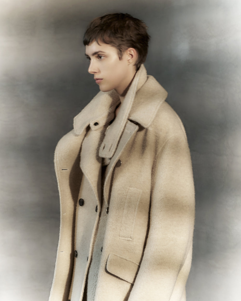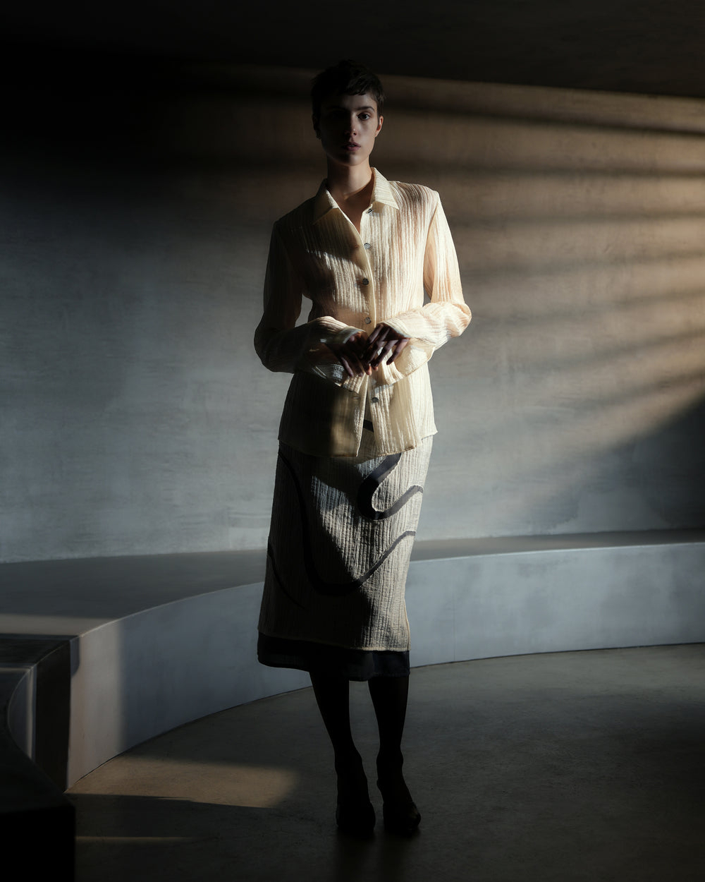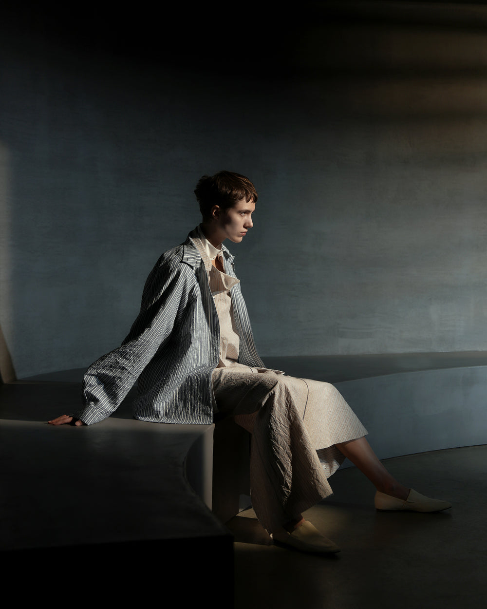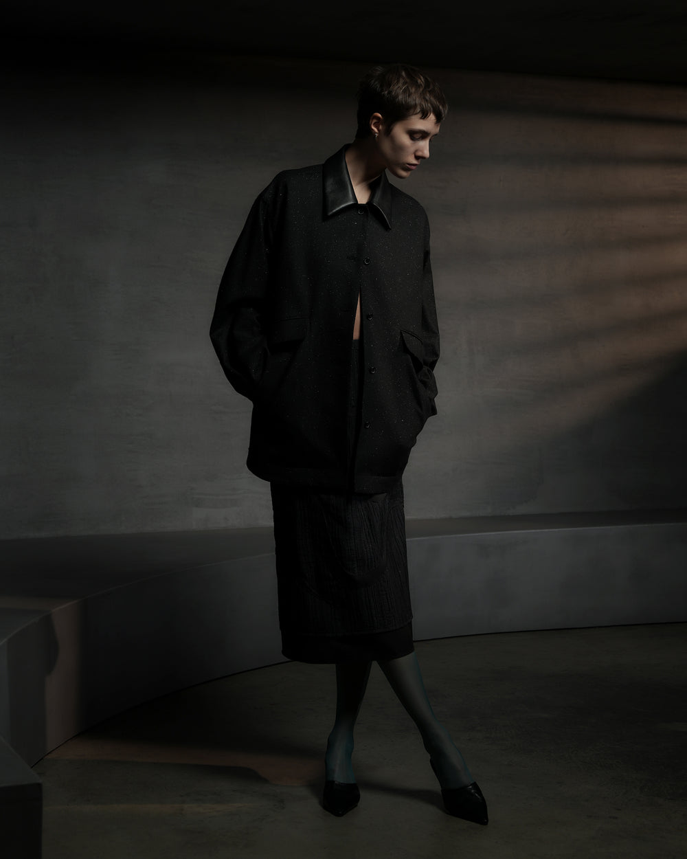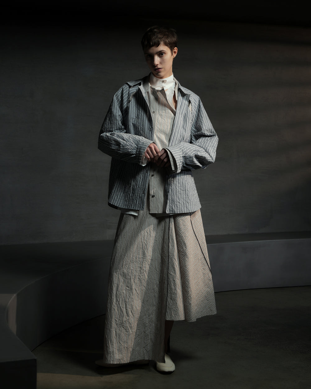 By delving deeper into the theme from our spring/summer collection, we have unveiled new landscapes. We adopted dyeing techniques such as chusen and urban processing to reflect the mingling colors of the sea. Expressing the quiet yet powerful movement of waves, we used three-dimensional curves and patterns. Additionally, we proposed the sparkling reflection of sunlight on the seaside with stud embellishments and metallic textures. This collection aims to let you feel the delicate nuances of nature and humanity within the garments.
