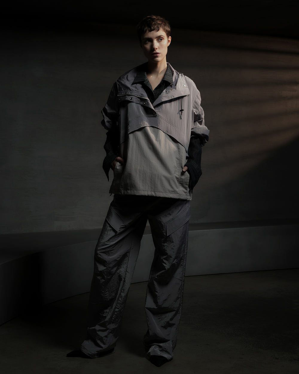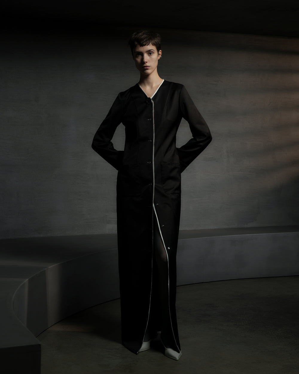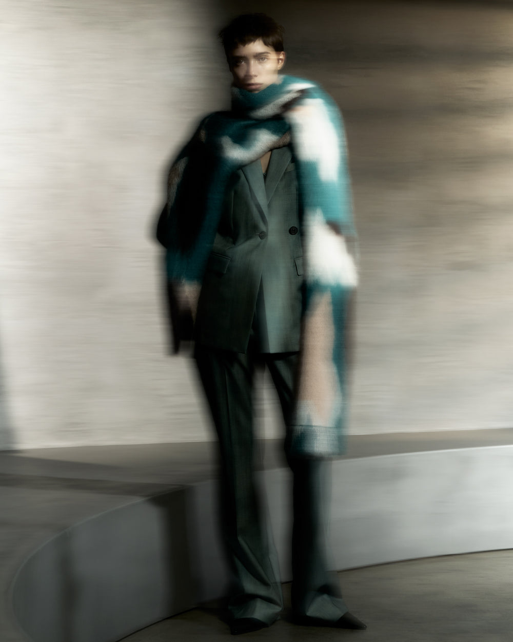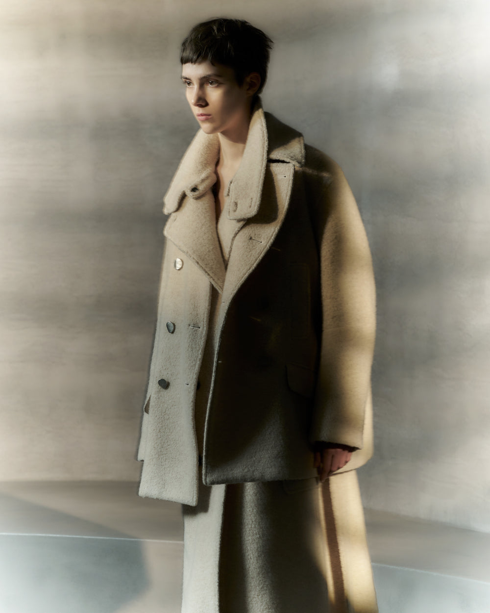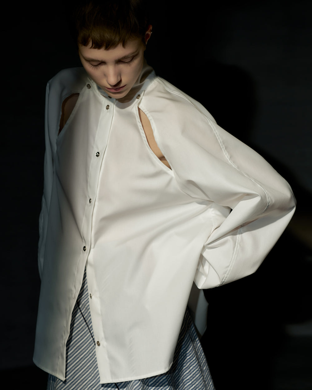 By delving deeper into the theme from our spring/summer collection, we have unveiled new landscapes. We adopted dyeing techniques such as chusen and urban processing to reflect the mingling colors of the sea. Expressing the quiet yet powerful movement of waves, we used three-dimensional curves and patterns. Additionally, we proposed the sparkling reflection of sunlight on the seaside with stud embellishments and metallic textures. This collection aims to let you feel the delicate nuances of nature and humanity within the garments.