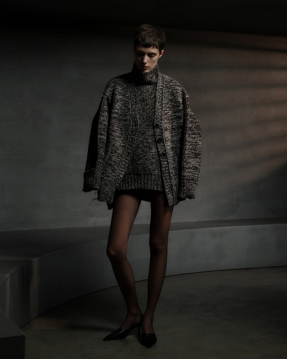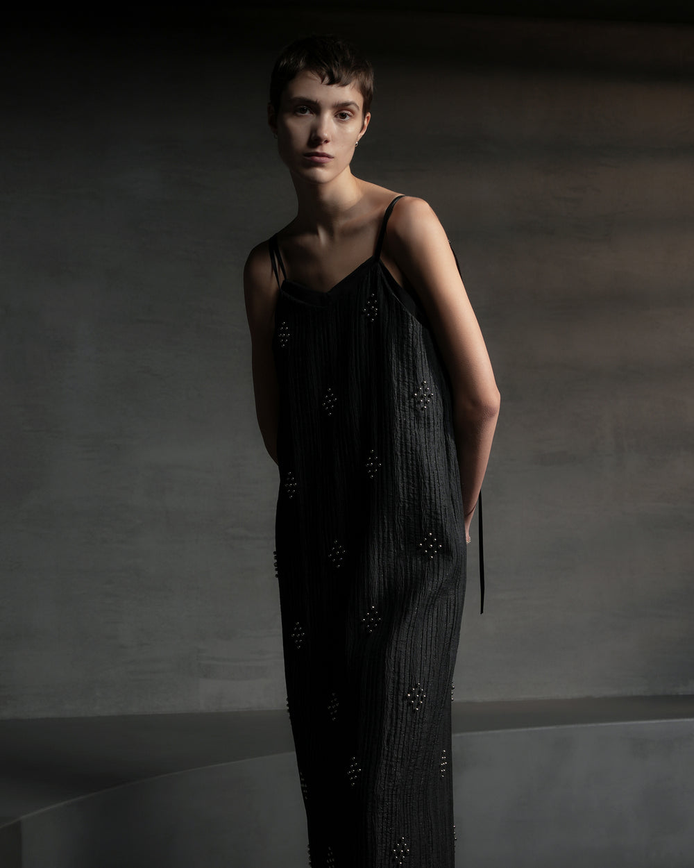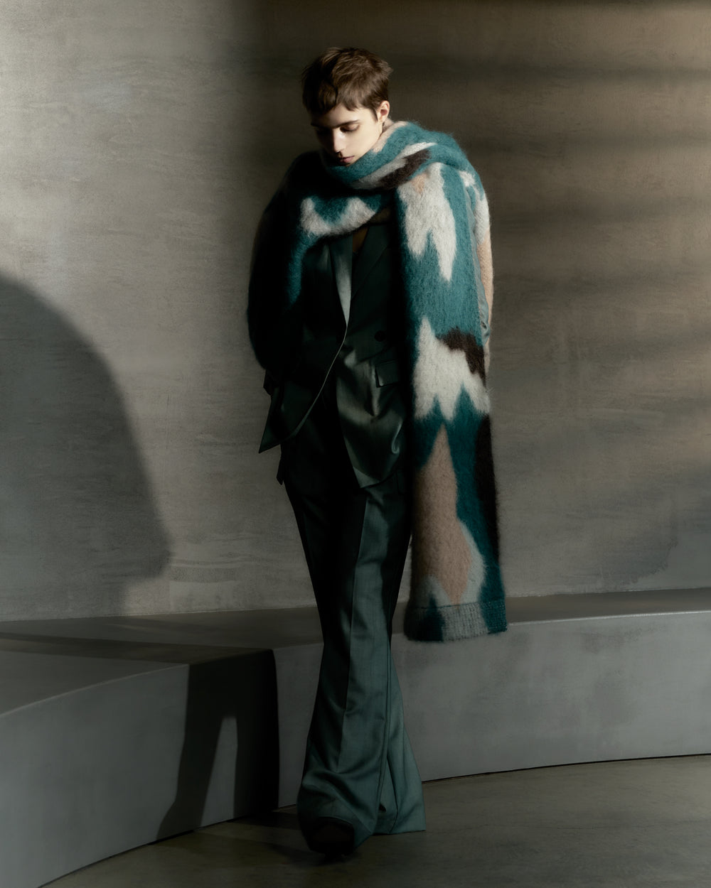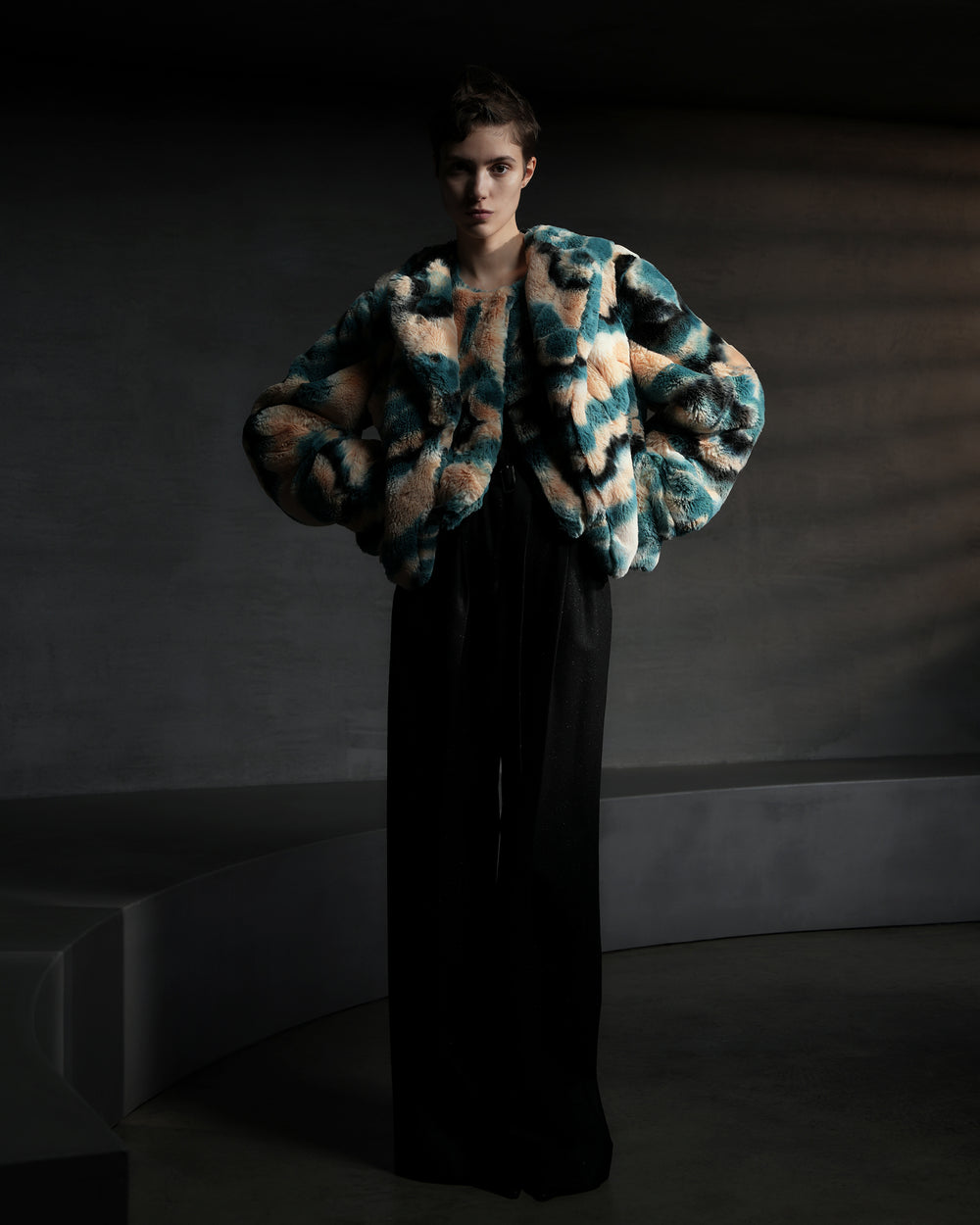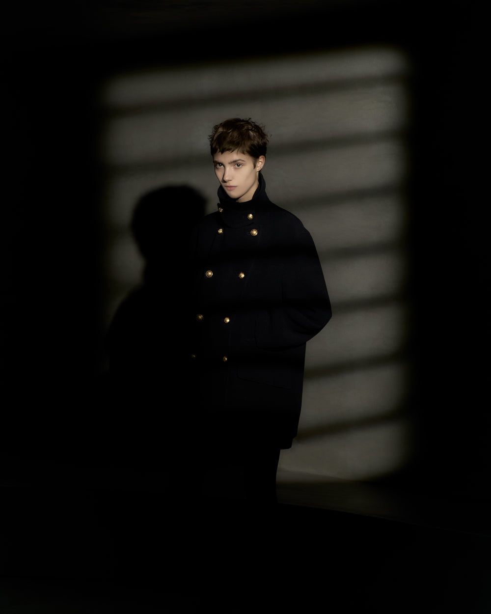 By delving deeper into the theme from our spring/summer collection, we have unveiled new landscapes. We adopted dyeing techniques such as chusen and urban processing to reflect the mingling colors of the sea. Expressing the quiet yet powerful movement of waves, we used three-dimensional curves and patterns. Additionally, we proposed the sparkling reflection of sunlight on the seaside with stud embellishments and metallic textures. This collection aims to let you feel the delicate nuances of nature and humanity within the garments.