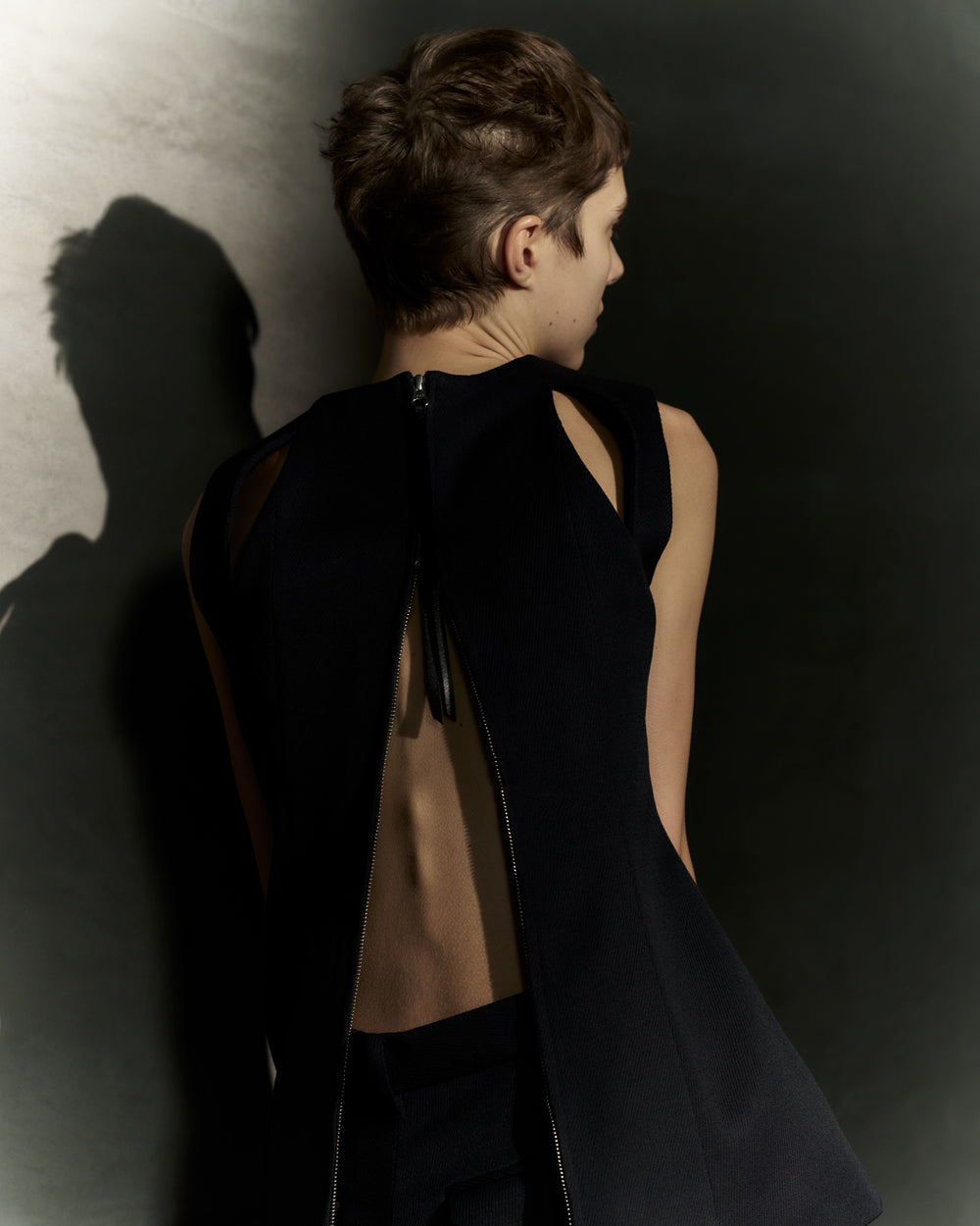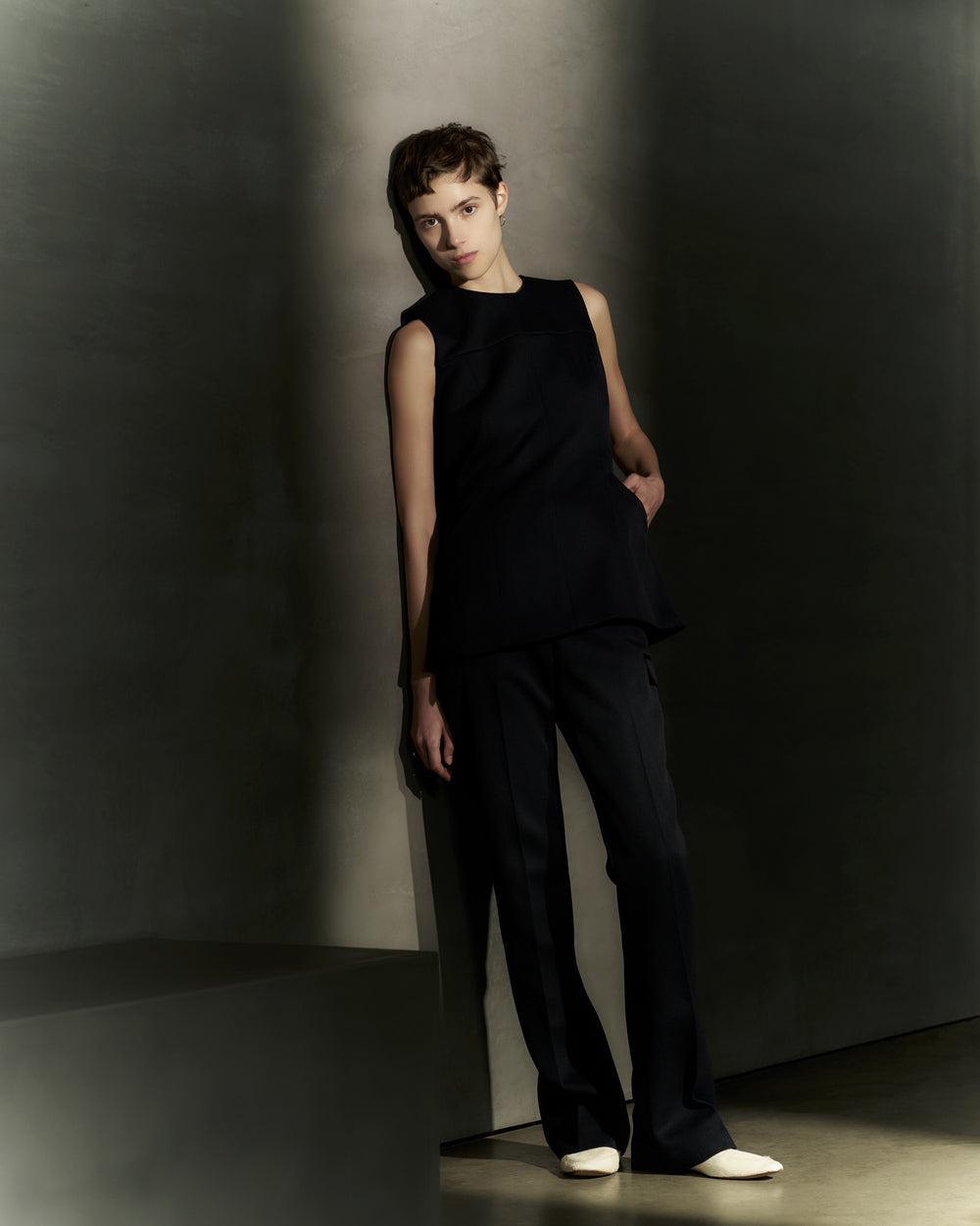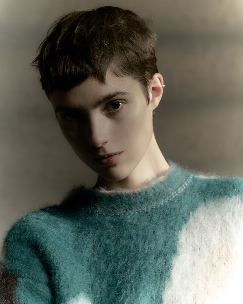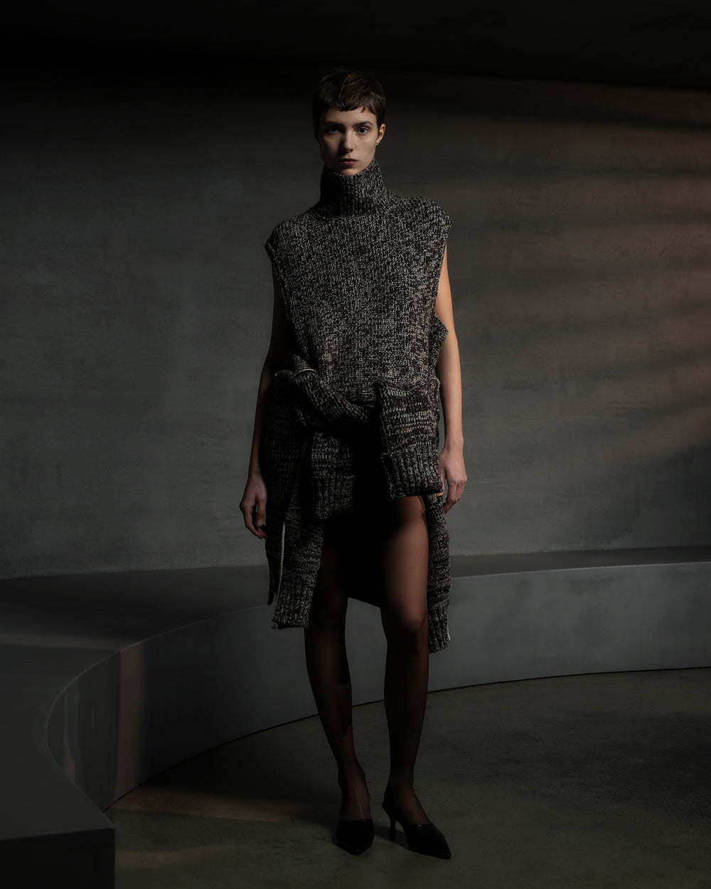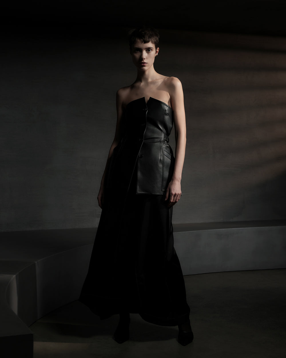 By delving deeper into the theme from our spring/summer collection, we have unveiled new landscapes. We adopted dyeing techniques such as chusen and urban processing to reflect the mingling colors of the sea. Expressing the quiet yet powerful movement of waves, we used three-dimensional curves and patterns. Additionally, we proposed the sparkling reflection of sunlight on the seaside with stud embellishments and metallic textures. This collection aims to let you feel the delicate nuances of nature and humanity within the garments.