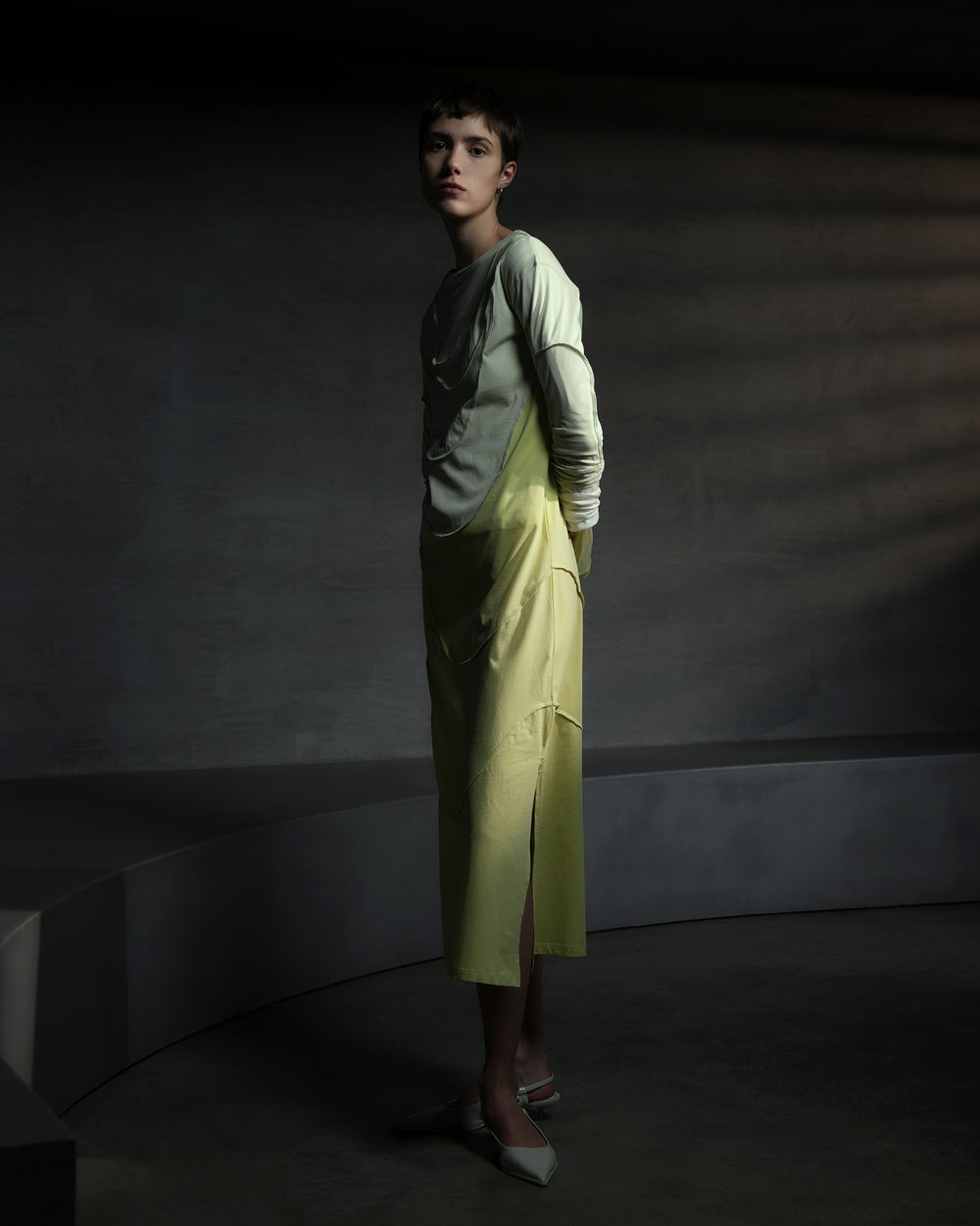 Following our spring/summer collection, we have taken inspiration from the natural phenomenon of halocline, which occurs in seas and rivers. When rivers of different water qualities converge into a single flow, the two currents do not mix. Instead, they create a blurred boundary, resembling the beautiful effect of paint dripping onto the water’s surface. Capturing the moment when different properties accidentally meet, we have incorporated this into our collection.