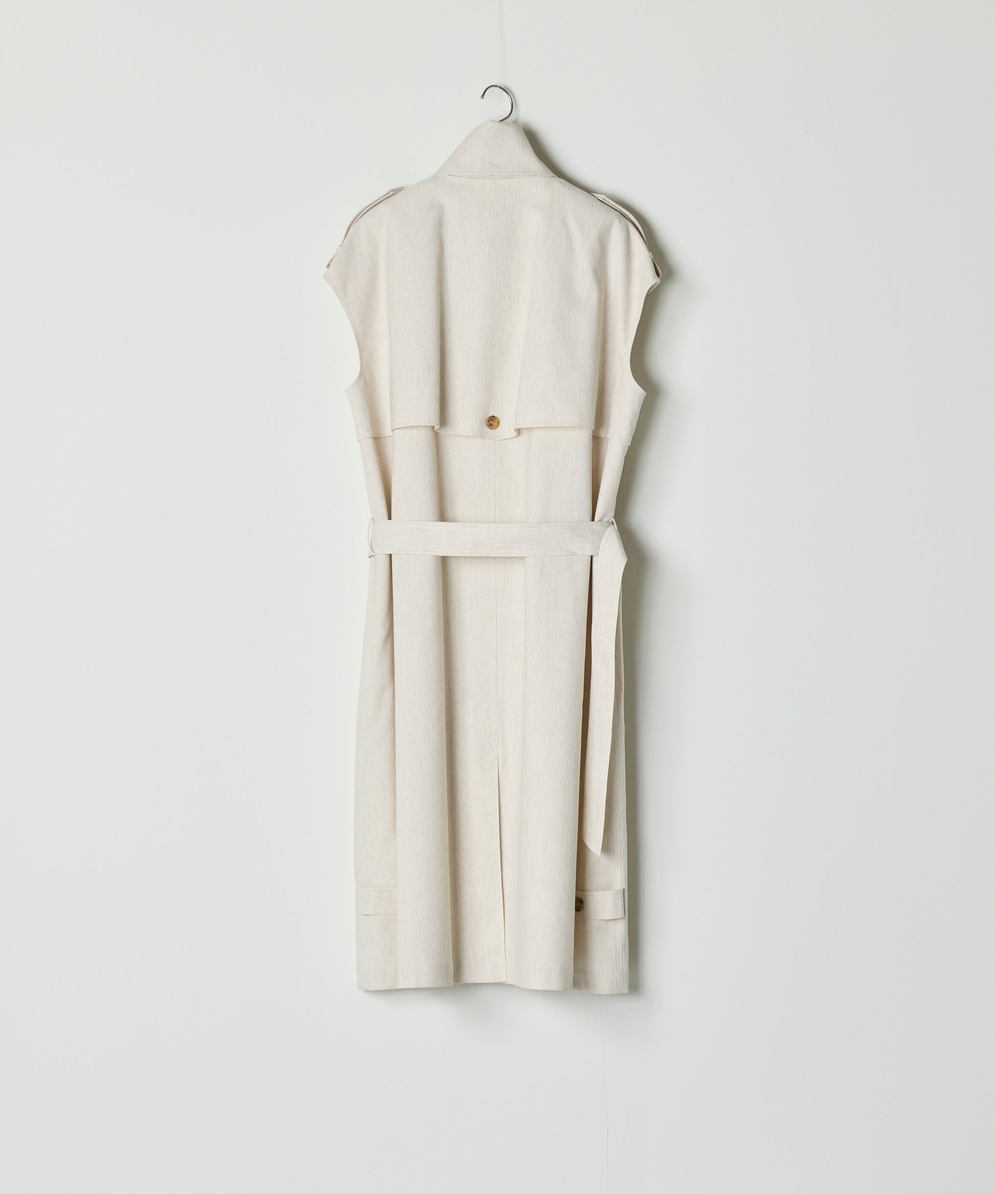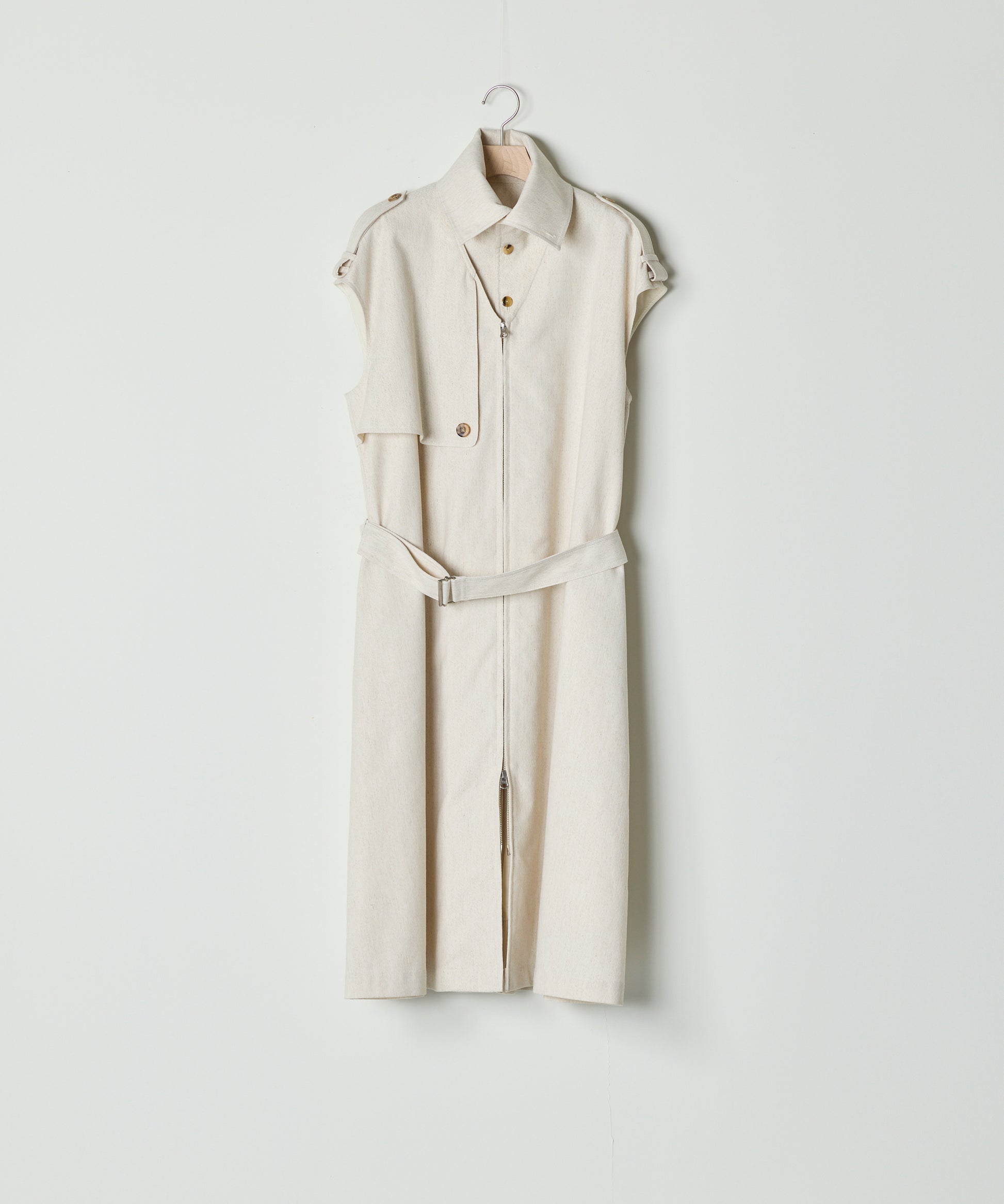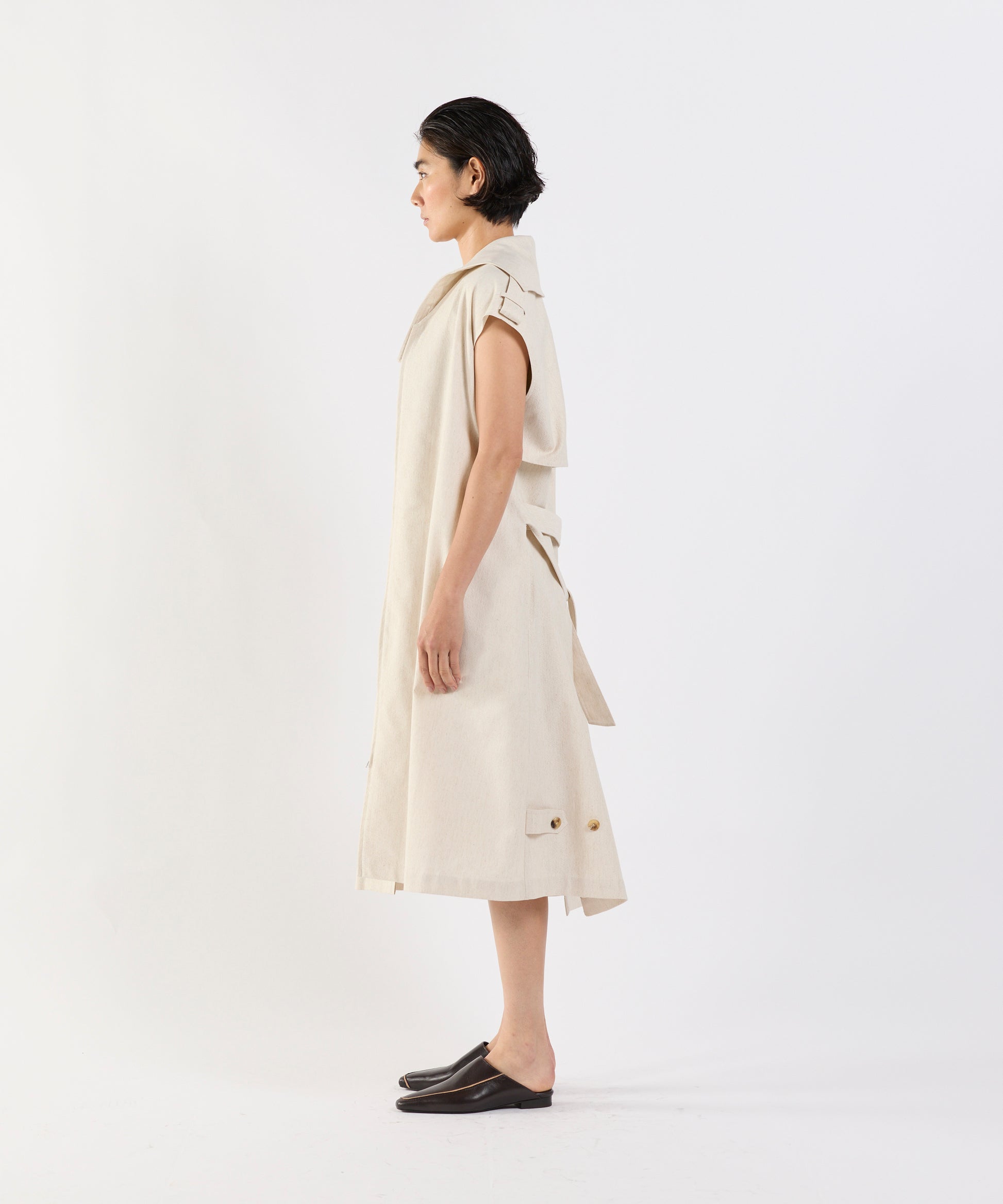 クラシックなトレンチディテールをベースに、アシンメトリーなケープ風パーツを重ねたドレス。マットな質感と程よいハリ感を併せ持つポリエステル×リネン素材が、構築的なフォルムと軽やかな着心地を両立します。ウエストベルトでシルエットに変化をつけたり、ジップアップフロントで着脱もスムーズに。都会的なニュアンスと機能性を兼ね備えた一着です。(サンプルサイズ38)