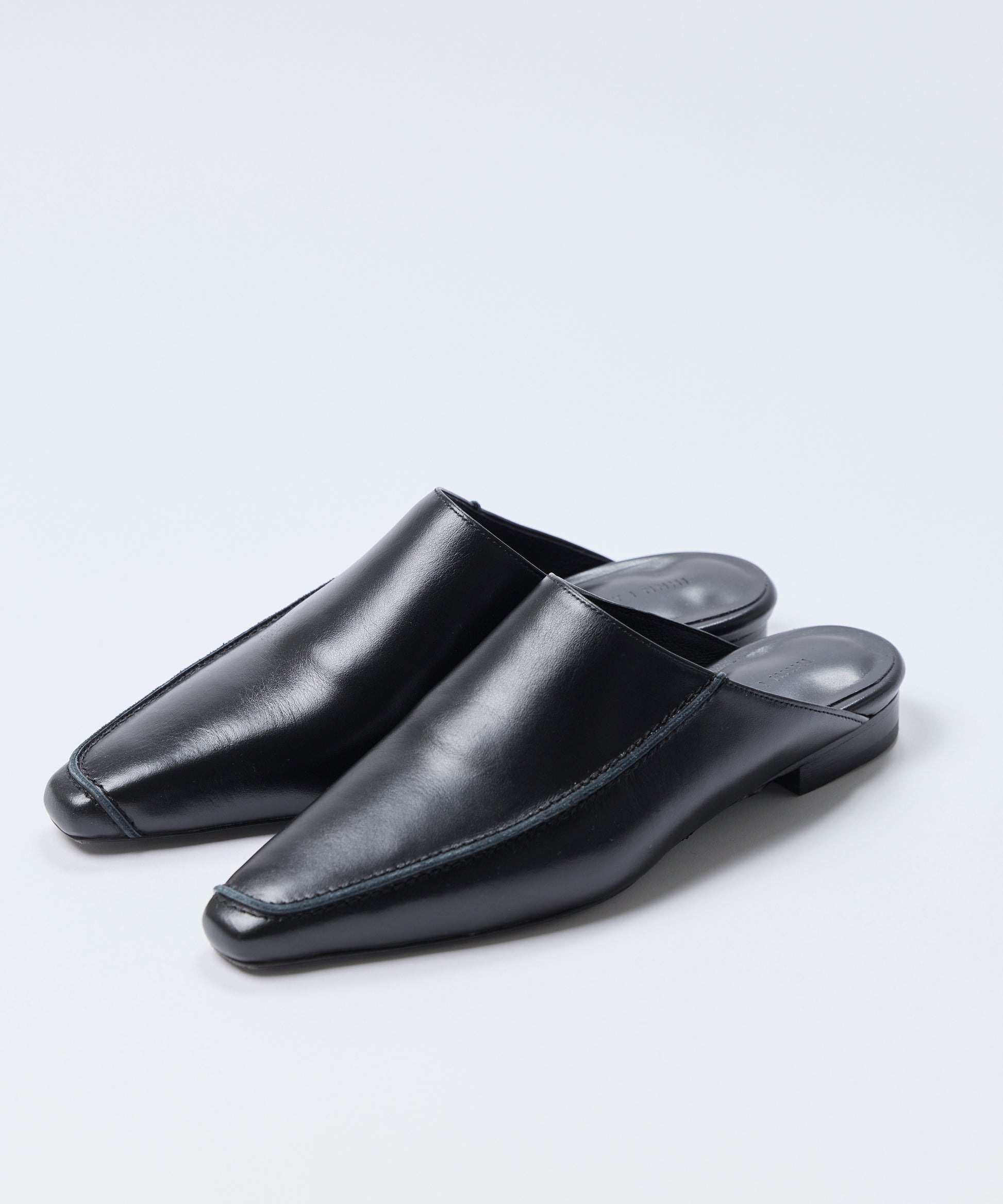 シャープなトゥラインに、片側だけを縁取るアシンメトリーな切り 替えステッチが特徴的なミュール。ミニマルなシルエットにわずか なデザインのひねりを加えることで、端正さとモード感を両立。柔 らかなレザーを使用し、足入れのしやすさと上品な光沢を備えてい ます。フラットに近いローヒールで日常使いにも適した一足。韓国 ブランド LUMEN とのコラボレーションにより誕生した特別なモデ ル。