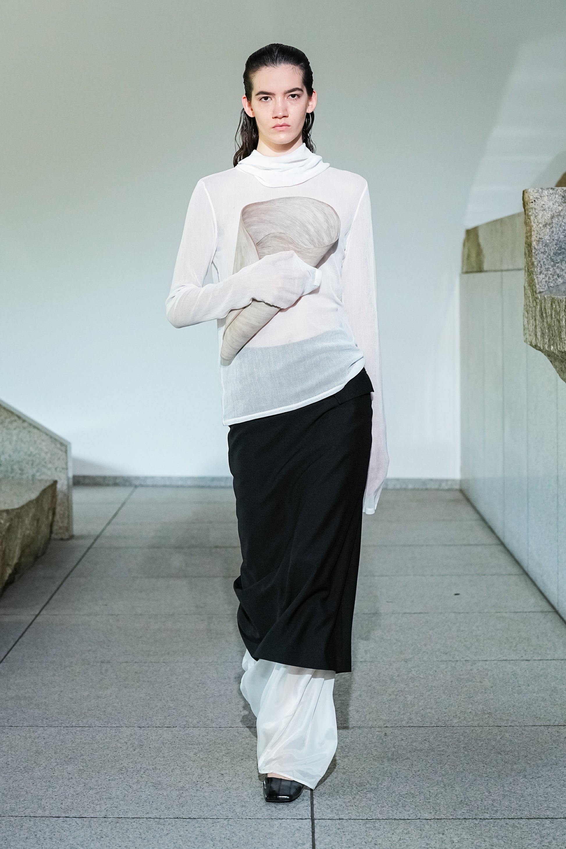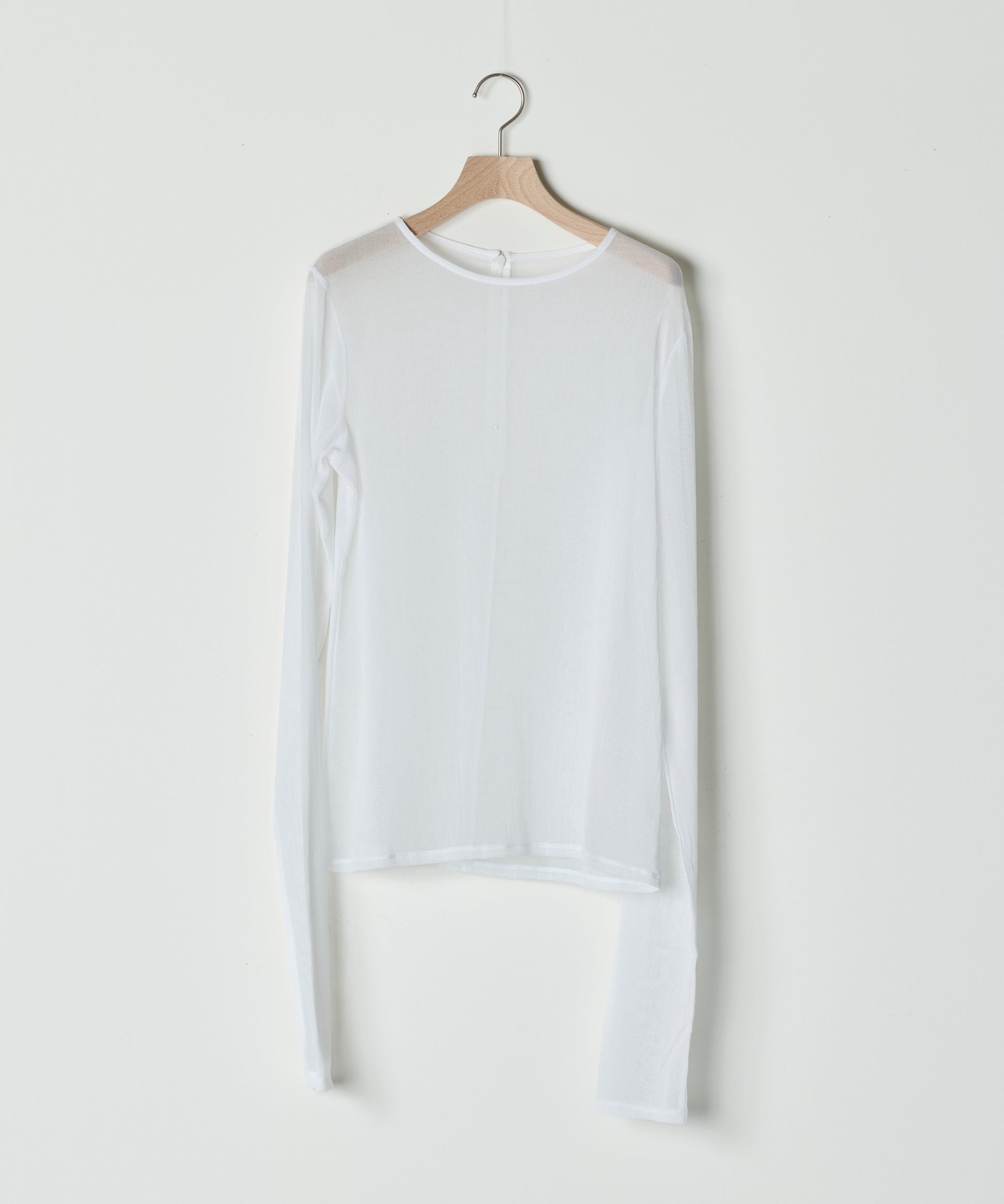 透け感のある繊細なコットンメッシュを使用したロングスリーブト ップ。取り外し可能な付け衿デザイン。折り返しやハイネックとし ての着用が可能な2WAY仕様です。1枚でもレイヤードでも着用可能 で、素材の持つナチュラルな風合いと軽やかさがミニマルな中に柔 らかな印象を添えます。