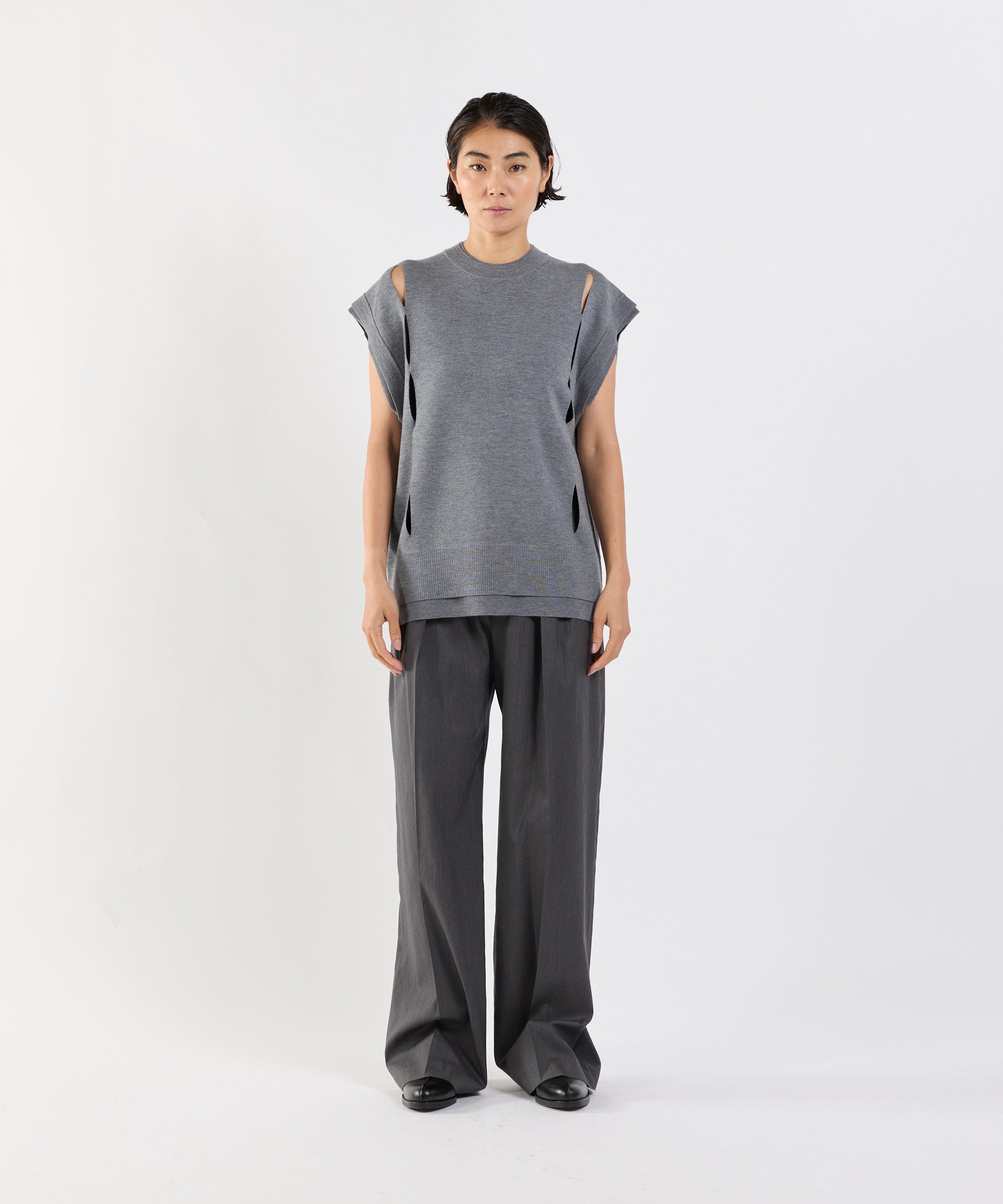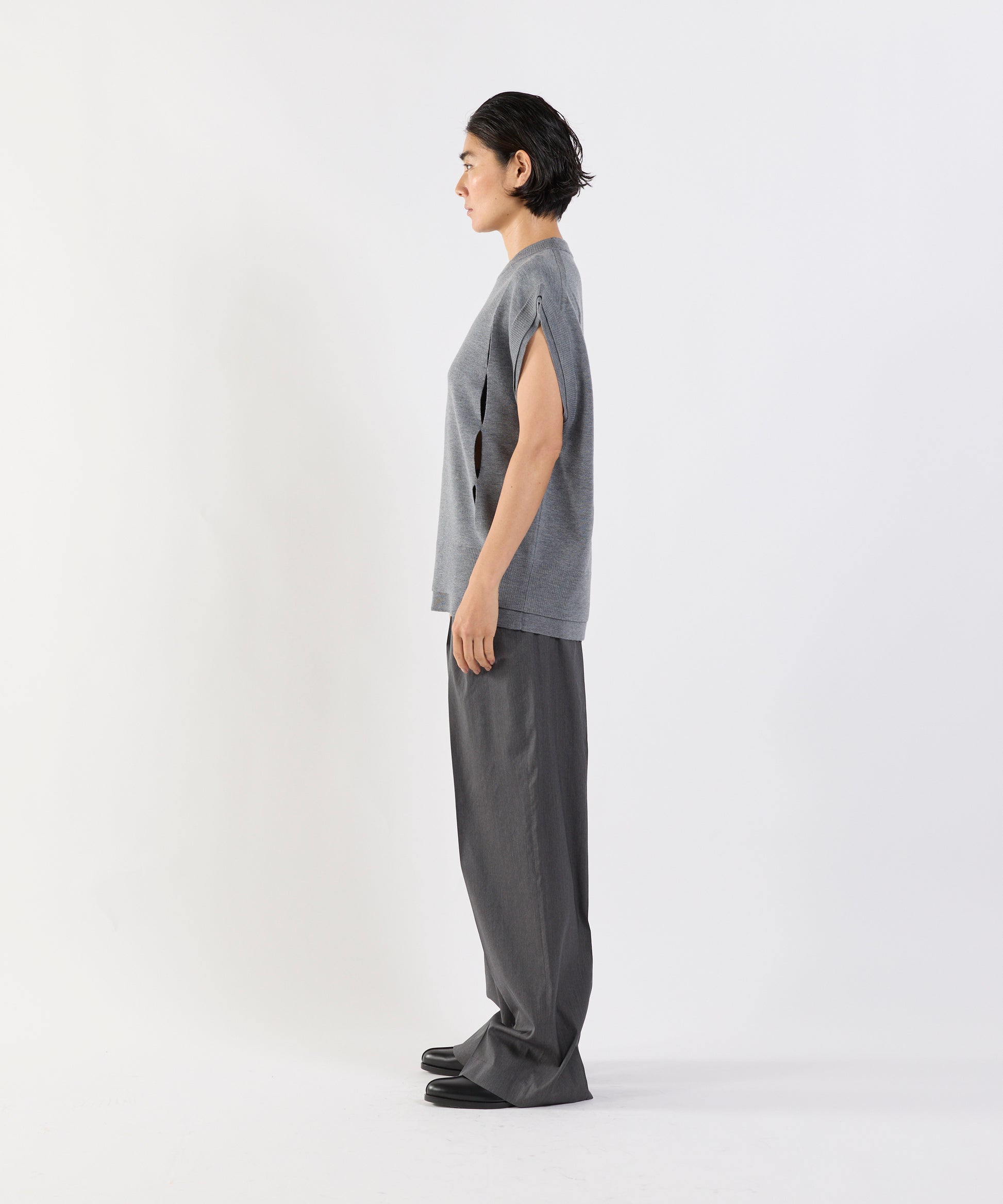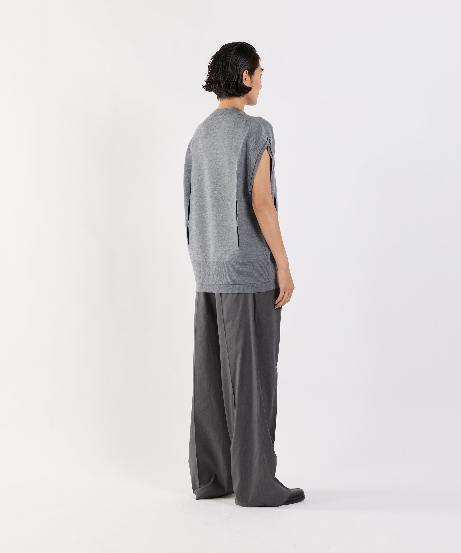 大胆に入れられたスリットが印象的なウール100%のニットベスト。 フロントからバックにかけて施されたカットアウトは、レイヤード するアイテムとの組み合わせ次第で、さまざまな表情を楽しめます 。一枚で着るのはもちろん、シャツやカットソーとのレイヤードス タイルにもおすすめです。